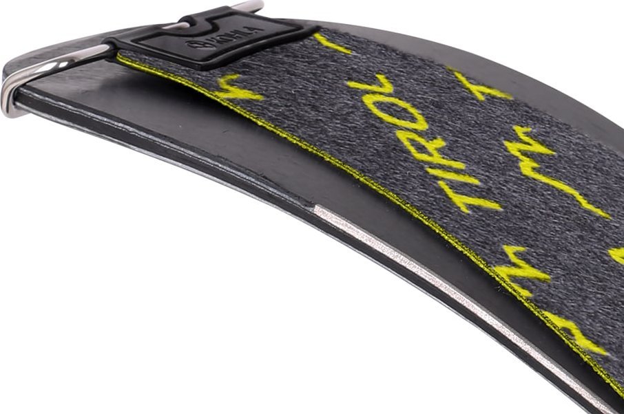 Die Anpassung für Double-Tip-Ski mit abgerundeten Skienden erfolgt mit einem Multi-Clip-System. Das Fell wird gekürzt und mit einer Schablone auf die richtige Länge zugeschnitten.
