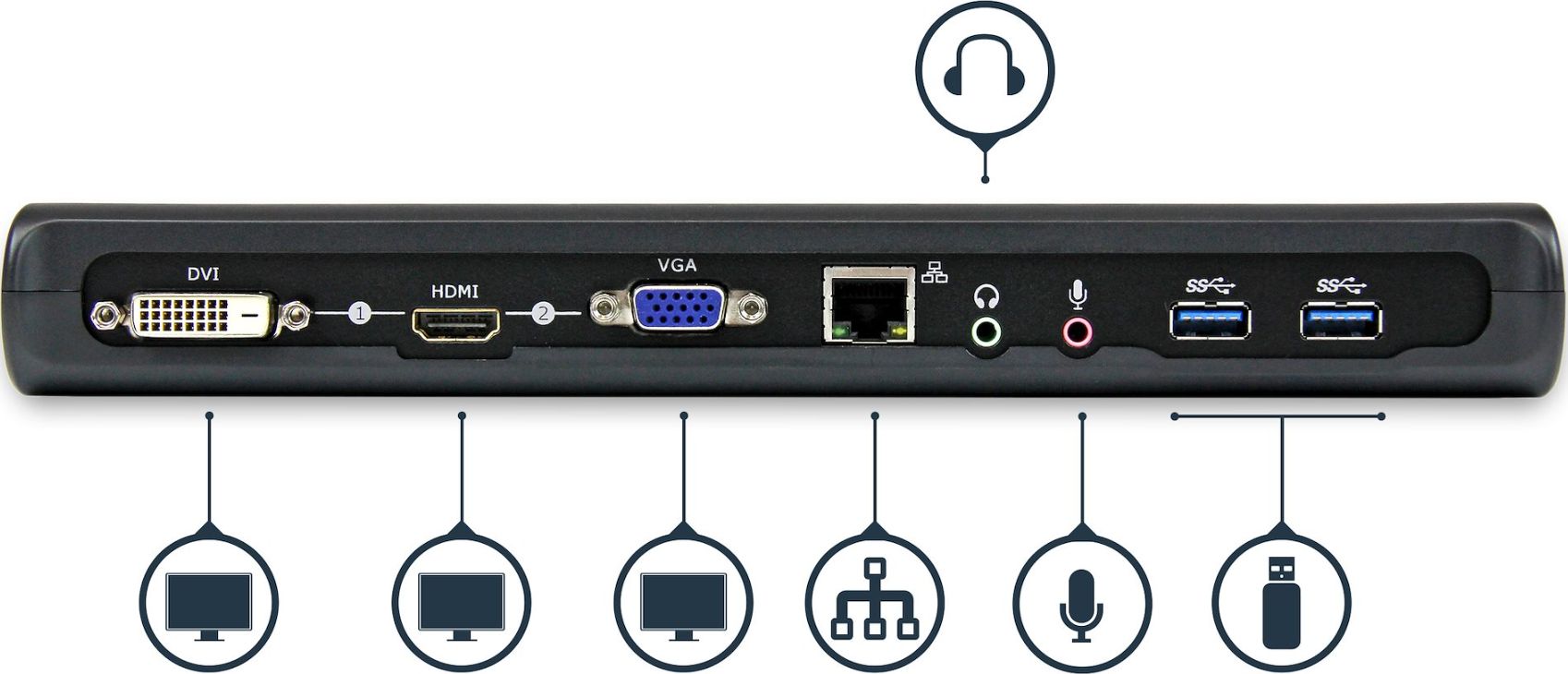 Diese vielseitige USB 3.0-Dockingstation umfasst drei externe Monitorausgänge (HDMI, DVI-D und VGA), die verschiedene Kombinationen (HDMI und DVI-D oder HDMI und VGA) ermöglichen, um Ihren Desktop zu erweitern oder zu duplizieren. Jeder Videoausgang unterstützt HD-Auflösungen (High Definition) (maximal 2048) und HD-Videowiedergabe, was eine ideale Lösung zur Erweiterung der Videokapazität eines Laptops ist.