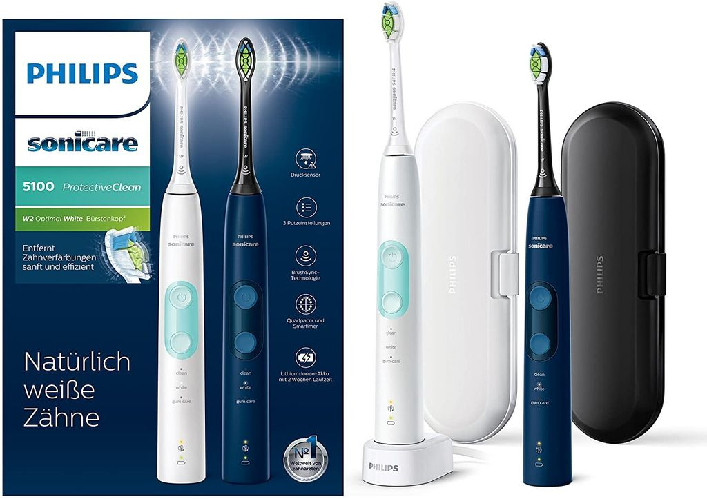 2 piezas de mano ProtectiveClean (1 blanco / azul claro, 1 azul oscuro), 2 cepillos W2 OptimalBlanco (1 blanco, 1 negro), 2 estuches de viaje (blanco y negro, sin función de carga), 1 estación de carga.