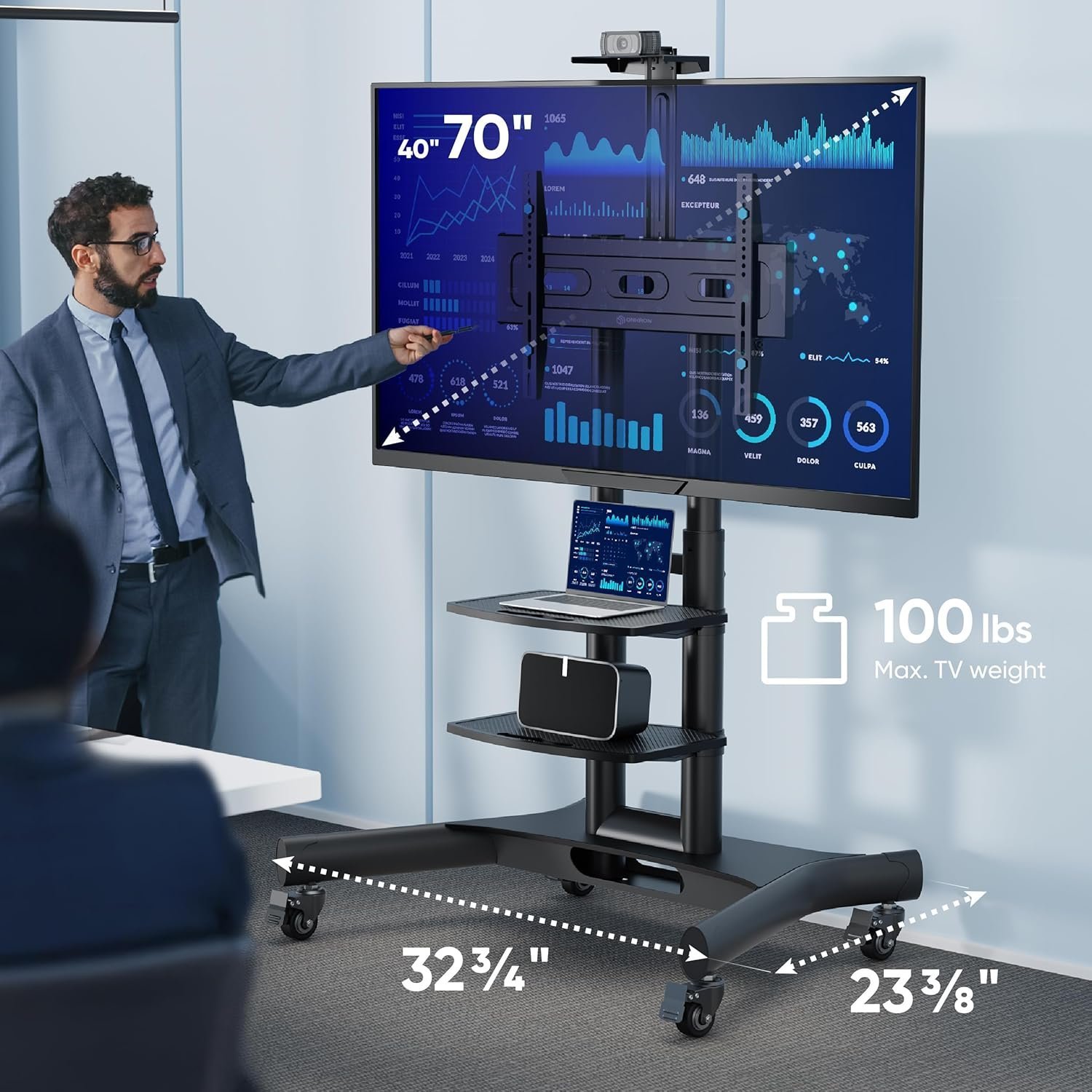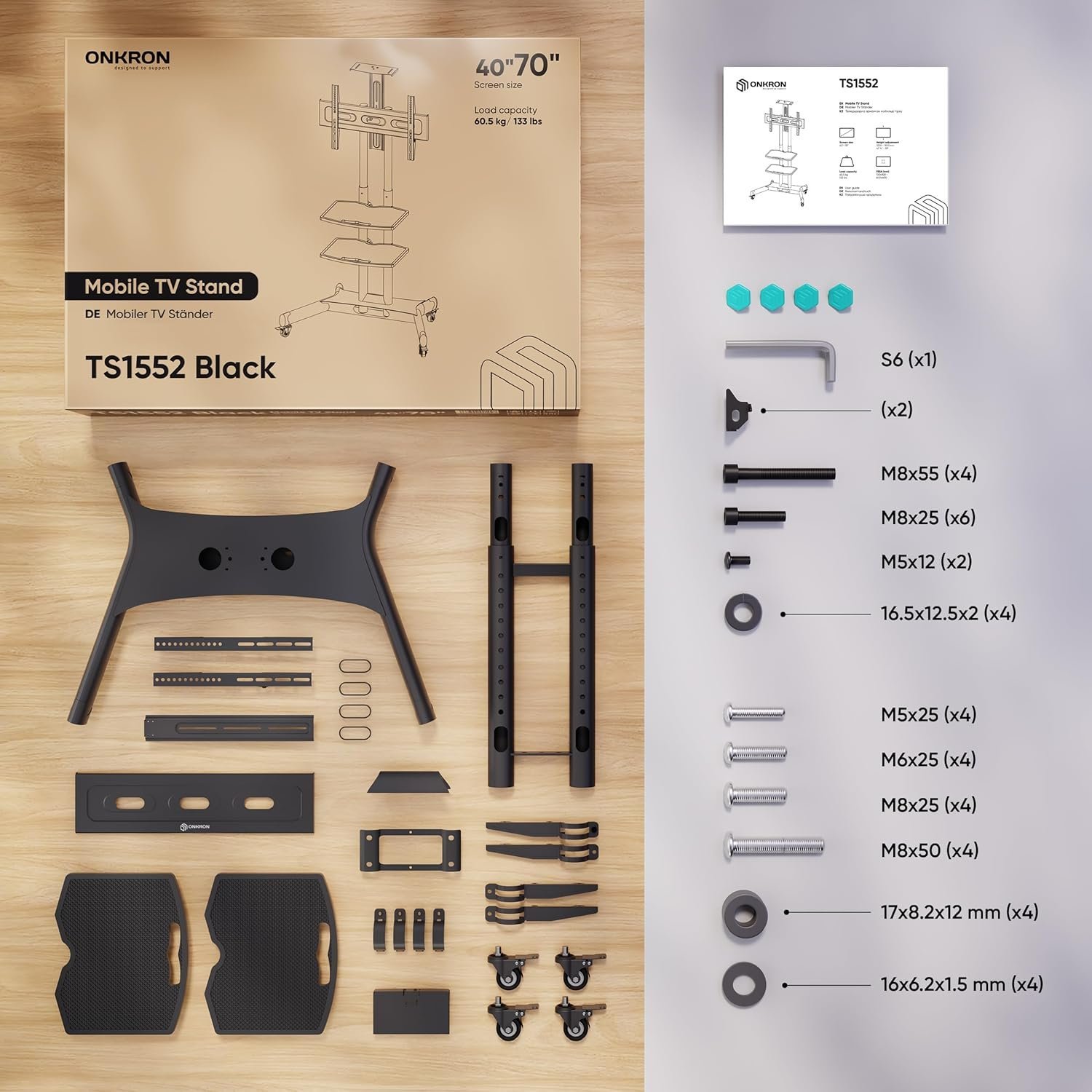 Support TV mobile : ONKRON TS1552-B est un support TV mobile à roulettes pour écrans TV de 40 à 70 pouces : Le chariot TV roulant supporte jusqu'à 100 livres : Support TV roulant réglable en hauteur de 47.2 pouces à 59 pouces : Le support TV mobile pour écran plat s'adapte à 100 x 100 - 600 x 400 pouces 0 trous de fixation VESA