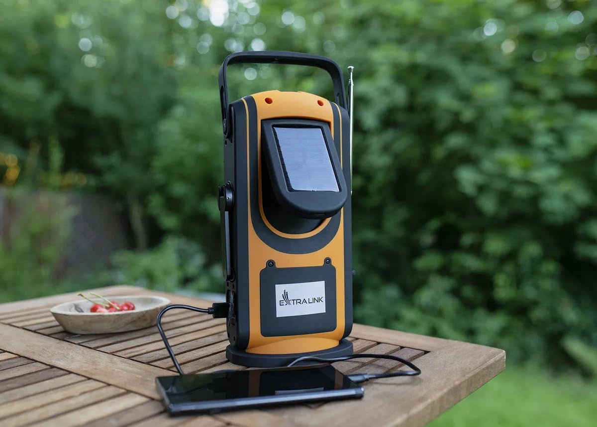 It has a built-in 6000 mAh battery that allows you to power your devices, up to two simultaneously. Capable of tuning to AM and FM frequencies, it includes a torch with different lighting modes and 4 charging methods, making it ideal for camping or long trips.
