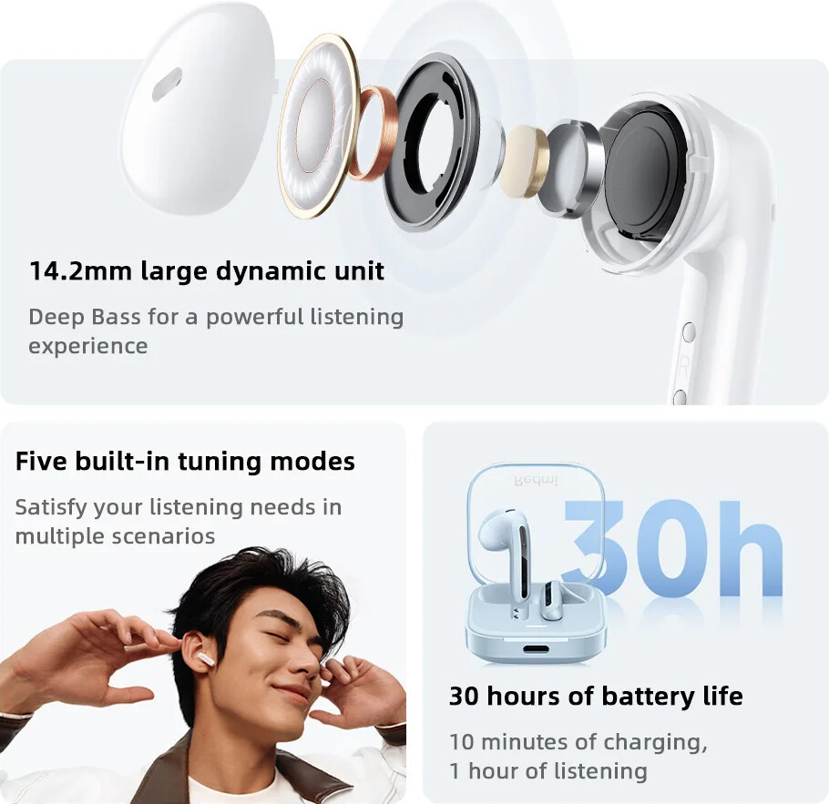 The 14.2 mm drivers in the Redmi Buds 6 Active deliver deep, bass-responsive sound. In addition, with the Xiaomi Earphone app you can access the equaliser and choose from 5 predefined settings to adapt the sound to your preferences. On the other hand, the headset's built-in microphone system features a noise reduction algorithm, bringing greater clarity to every call, even in windy environments.