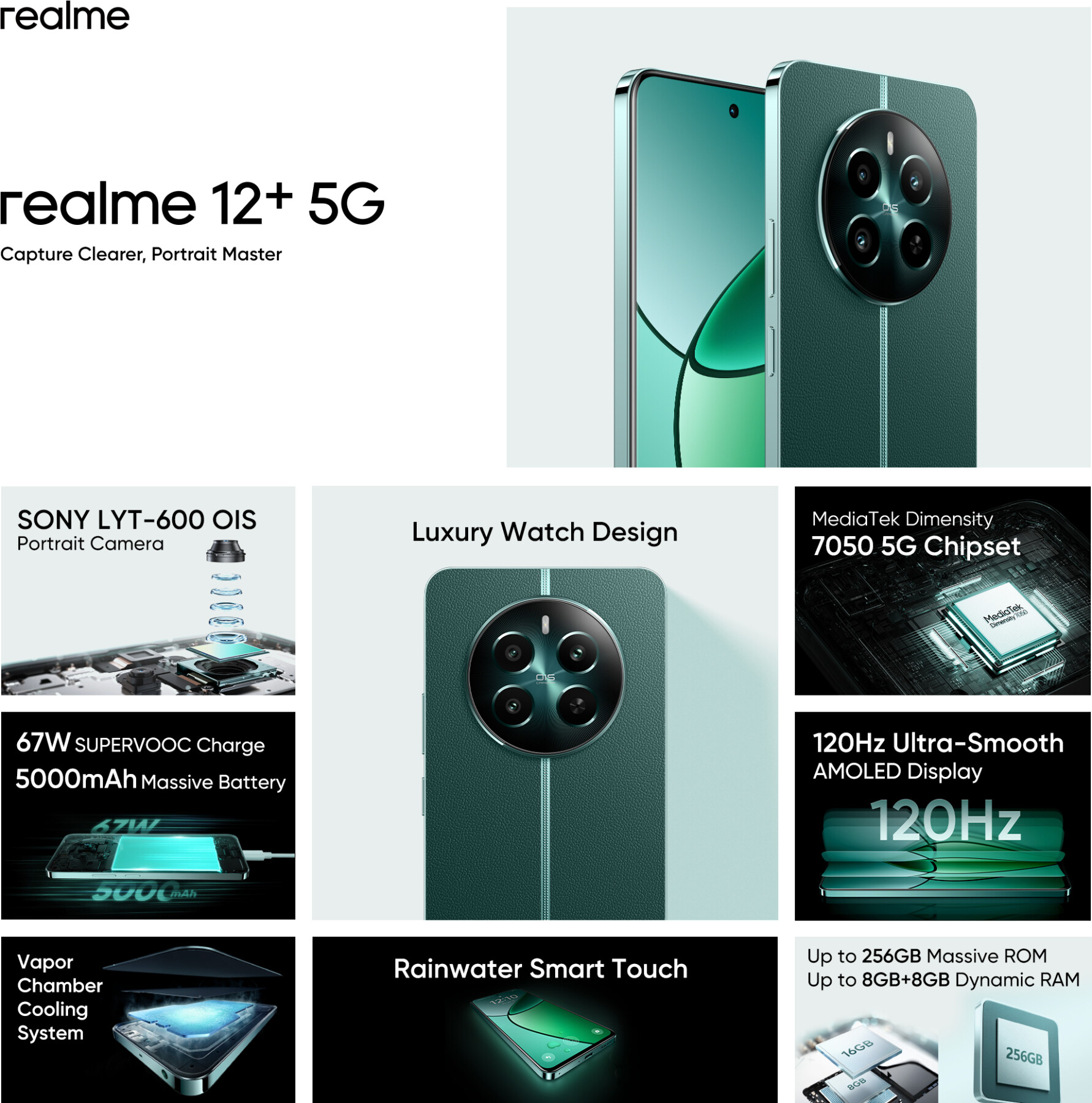 Read more...The Realme 12+ 5G is a high-end smartphone that offers exceptional performance and an unmatched user experience. Equipped with a powerful MediaTek Dimensity 7050 5G processor and 8GB of RAM, this device guarantees smooth and efficient operation for all your daily tasks.