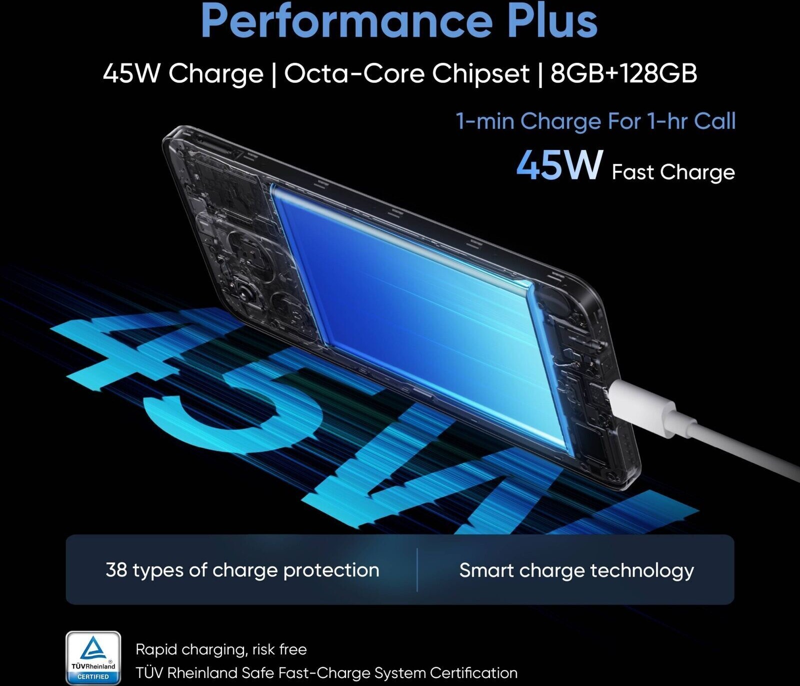 - 45W Fast Charging. The fastest 45W fast charging in the segment. Charge for minutes and call for hours.