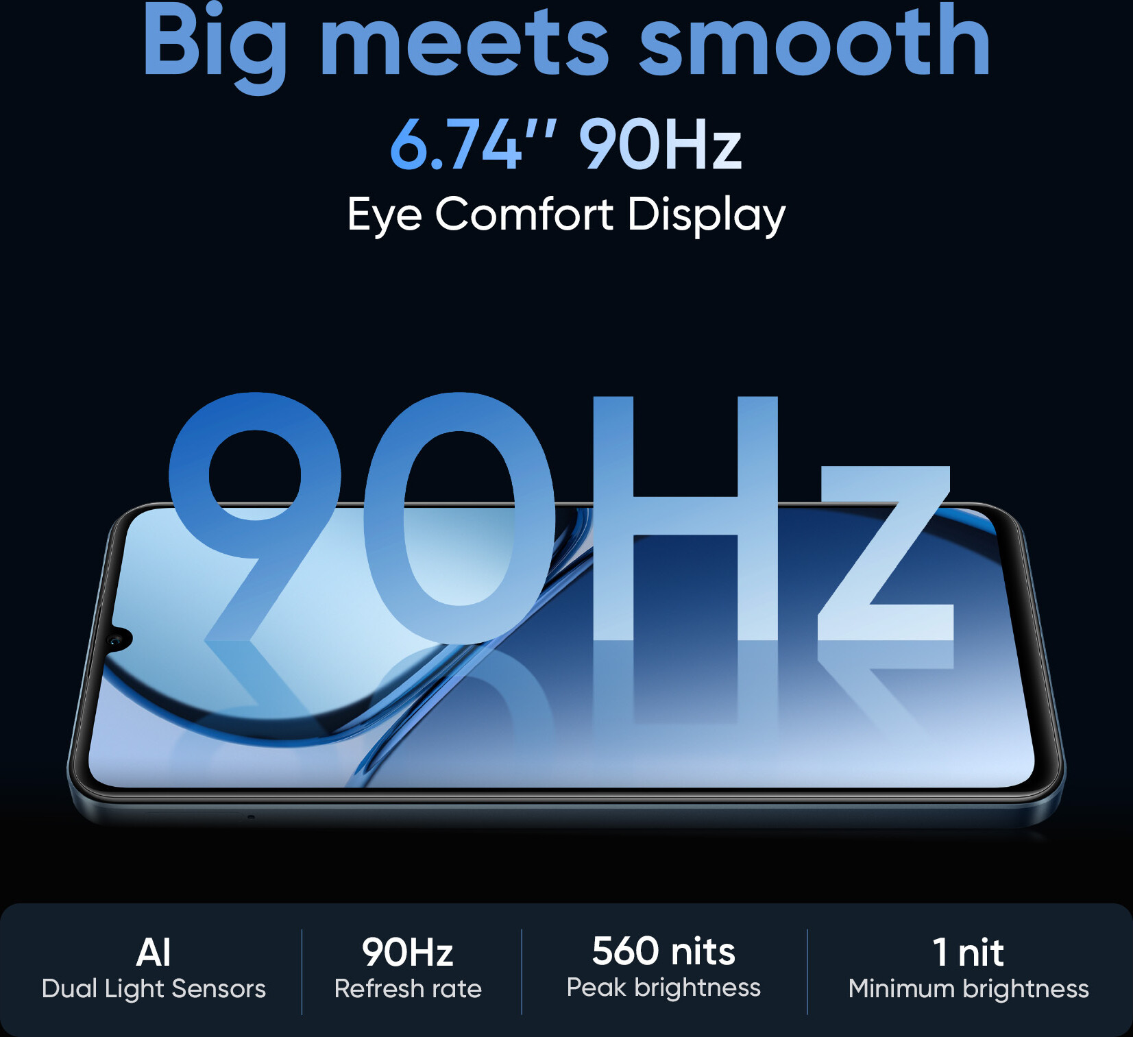 With its 6.74" 90Hz display, enjoy a more immersive viewing experience that's gentle on your eyes. The large screen size combines with dual AI light sensors to deliver an optimal viewing experience every time, with perfect brightness and visibility. And with built-in eye protection, you get a best-in-class viewing experience, designed for long phone sessions.