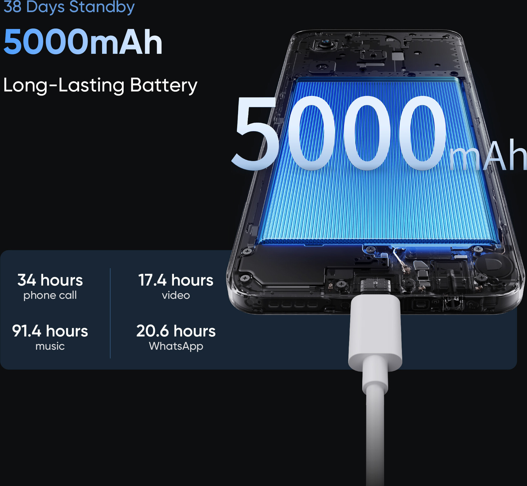 - Long-lasting 5000mAh battery: 38 days standby time. Enjoy all your favorite entertainment, from games to movies and music, with plenty of power at the end of the day.