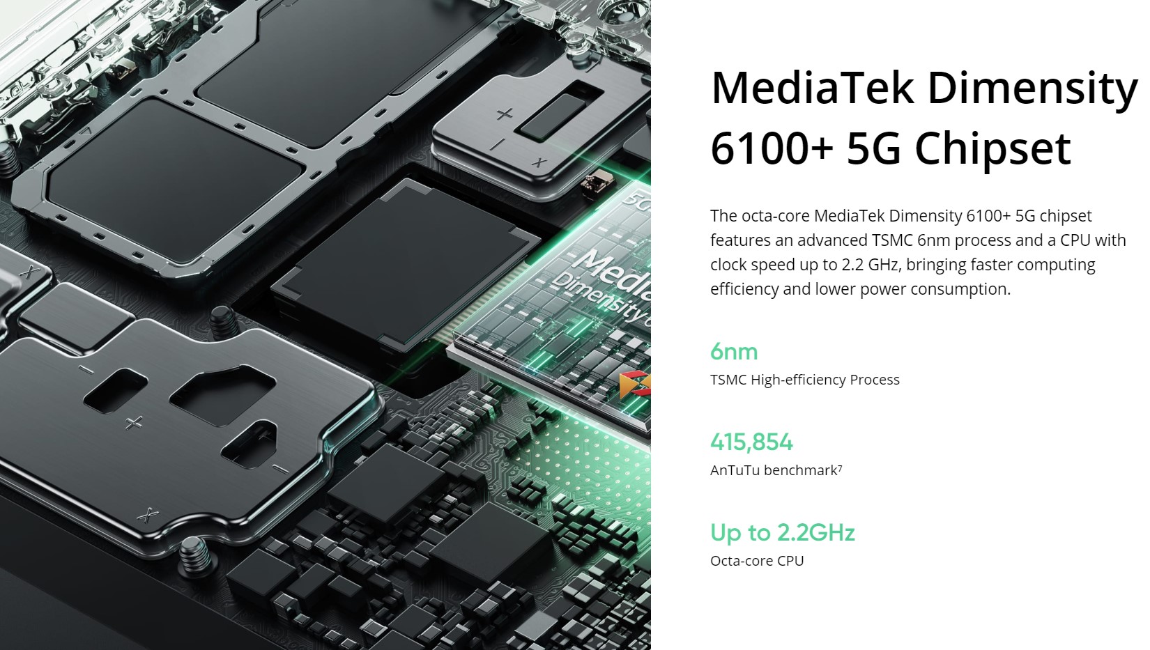 | Processor: | Octa Core, MediaTek Dimensity 6100+ 2x 2.2 GHz ARM Cortex-A76, 6x 2.0 GHz ARM Cortex-A55 |