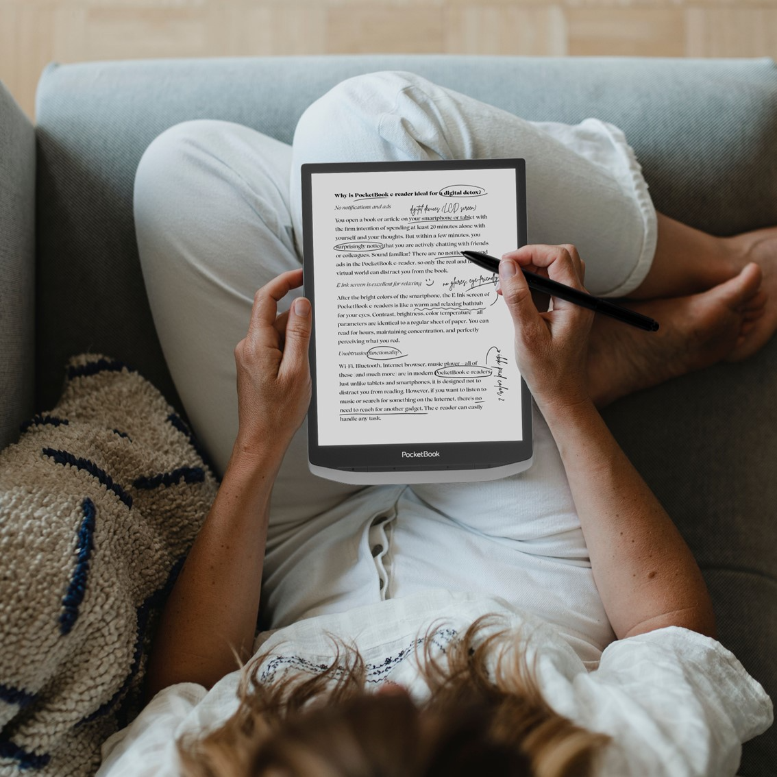 *E-Ink Letter Screen: The PocketBook InkPad in any light condition.