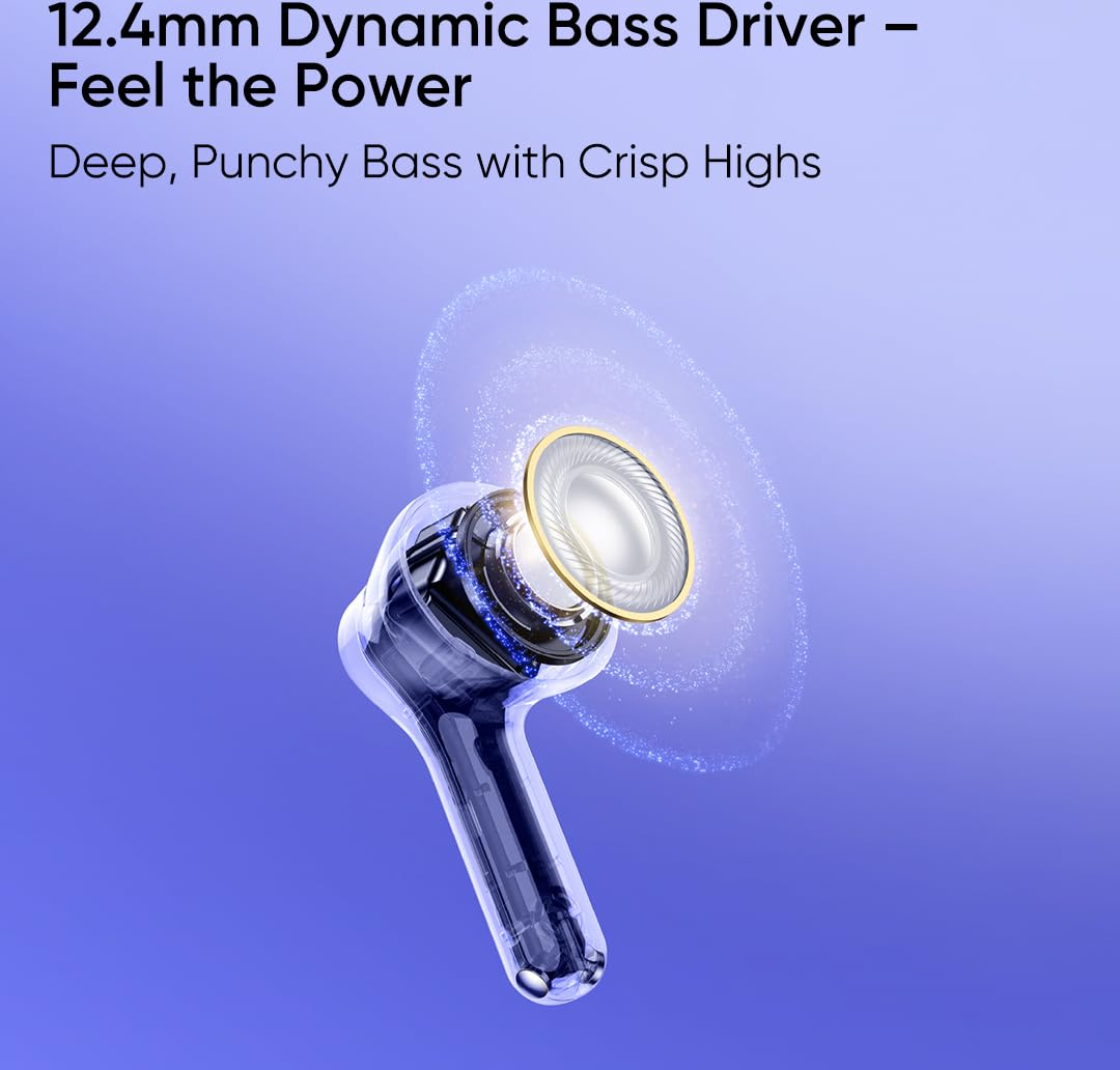 Os realme Buds T200 Lite estão equipados com controladores de graves dinâmicos de 12,4 mm que proporcionam graves ricos e profundos, bem como um som claro e nítido. Isto torna-os ideais para ouvir a sua música favorita, podcasts e filmes.